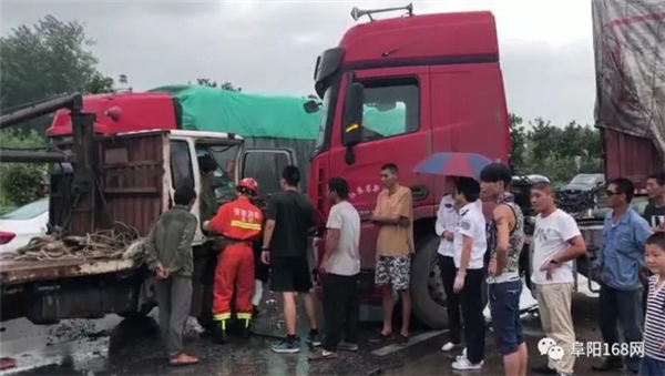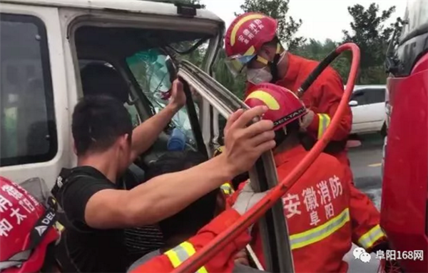 8月17日下午16时许,106国道太和县双浮镇加油站旁一辆大货车与小货车相撞,两车头部不同程度受损,小货车内一人被困。