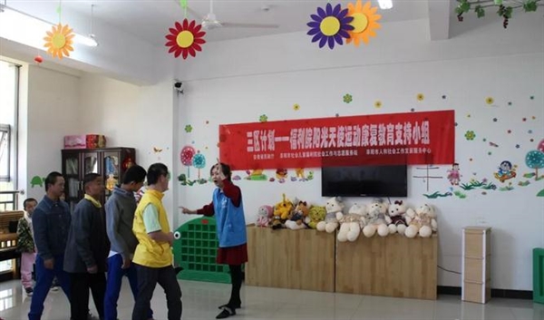 2018年4月19日,“三区计划”项目社工为阜阳市社会儿童福利院的孩子们开展了第五节阳光天使运动康复教育支持小组活动,这也是本次运动康复教育支持小组的最后一次活动。孤残儿童运动康复教育支持小组为组员创造了一个面对面的密切沟通的环境,组员们在这样一个环境中认识自我与他人,激发了组员们的运动能力。